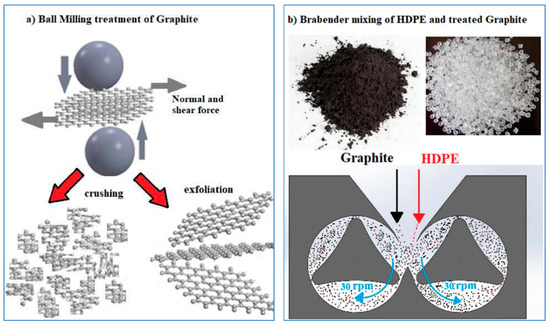 - Wakabayashi, K.; Brunner, P.J.; Masuda, J.; Hewlett, S.A.; Torkelson, J.M. Polypropylene-graphite nanocomposites made by solid-state shear pulverization: Effects of significantly exfoliated, unmodified graphite content on physical, mechanical and electrical properties. Polymer 2010, 51, 5525–5531. [Google Scholar] [CrossRef]