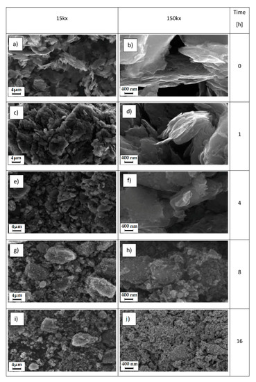SEM images of graphite at magnifications of 15 and 150 Kx at different ball milling times: (a,b) 0 h; (c,d) 1 h; (e,f) 4 h; (g,h) 8 h; (i,l) 16 h.