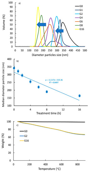 (a) Graphite size distribution as a function of treatment time of PE and the nanocomposites with dynamic light scattering (DLS). (b) Median diameter particle size vs. treatment time. (c) TGA analysis of PE, PE-G2, and PE-G16.