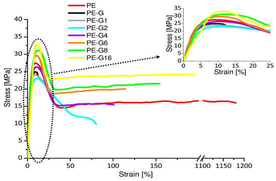 The stress–strain graphs of the pure PE and all the mixtures (PE-G0, PE-G1, PE-G2, PE-G4, PE-G8, and PE-G16) are shown in Figure 5. The PE-G0 sample (PE mixed with pure graphite, not mechanically treated) showed a different stress–strain curve than the pure PE. In fact, an increase in the slope of the initial section and an increase in stiffness were observed (Young’s elastic modulus increased from about 500 to about 900 MPa), as visible in the magnified graph in the frame of Figure 5. The mechanical strength, both at yield and at break, decreased from approximately 28 to approximately 25 MPa and from approximately 16 to approximately 12 MPa, respectively. Strain at break decreased considerably from approximately 1200% to approximately 22% with a corresponding collapse of the work at break from approximately 24 to approximately 7 J.