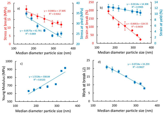 The mechanical parameters vs. the median diameter particle size is shown in Figure 6. We can observe the decreases of the stress at break and at yield (Figure 6a), the decreases in strain at break and at yield (Figure 6b), the increase in Young modulus (Figure 6c), and the decrease in work at break (Figure 6d), with the increasing of the mean diameter particle size.