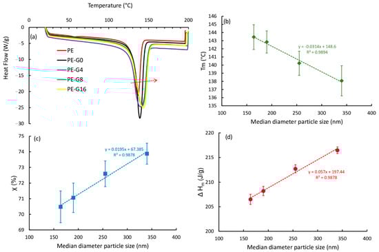 Figure 7a shows the DSC curves, while the relationships of the melting temperature and that of the degree of crystallinity with the median particle diameter are shown in Figure 7b,c, respectively. How the melting peaks of nanocomposites shifted toward right to higher vales were observed (as indicated by the row in Figure 7a), with respect to for the pure PE. Hence, the melting temperature decreased with increasing mean diameter particle size (Figure 7b), while the degree of crystallinity and the melting enthalpy increased (Figure 7c,d).