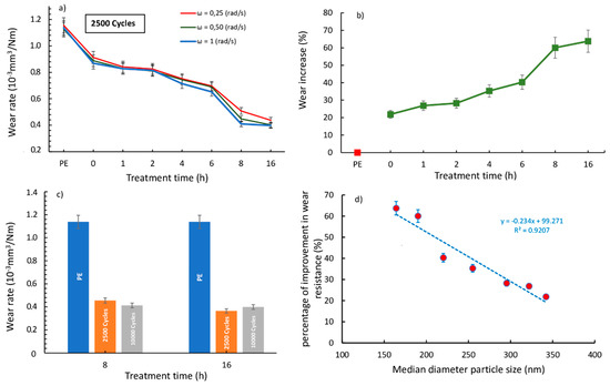 (a) Specific wear rates of PE and PE-G samples at different treatment times and angular speeds. (b) Percentage of improvement in wear resistance vs. the treatment time. (c) Wear rates at 2500–10.000 cycles for PE, PE-G8, and PE-G16 samples. (d) Percentage of improvement in wear resistance vs. the median diameter particle size.