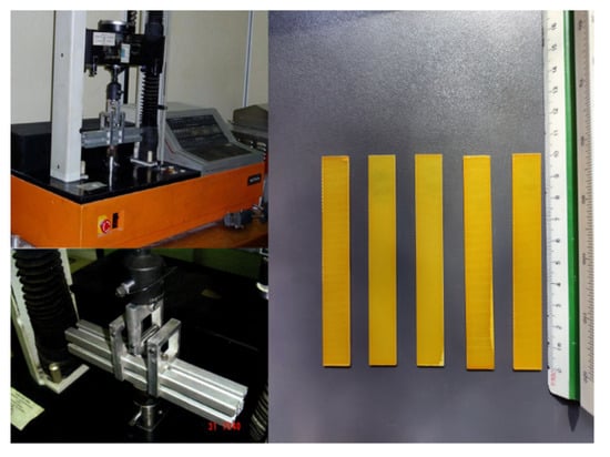 Pure epoxy resin and GFRP composite specimens had dimensions according to ASTM D790-03 standards. Stress relaxation experiments were executed using an Instron 4301 (High Wycombe, United Kingdom) universal testing machine. The specimens had dimensions of 100 × 12.8 × 2 mm and were placed on support rollers with a span of 63 mm (Figure 1). Initially, the machine started and continued to operate with a constant crosshead speed of 1 mm/min until the desirable displacement was reached. Then, the machine was stopped at the desirable displacements (4, 5 and 6 mm) for 45 and 100 min for the neat epoxy resin and composite specimens, respectively. Five or more specimens per each applied displacement value were tested to ensure the repeatability of results.