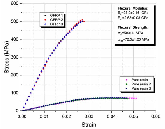 From this figure, the repeatability of experimental results can be observed. The flexural moduli of both materials are well within the manufacturers’ data, as shown in Table 1. The flexural strength of the GFRP composites and that of the neat epoxy resin was found equal to 503 ± 4 and 72.5 ± 1.26 MPa, respectively.