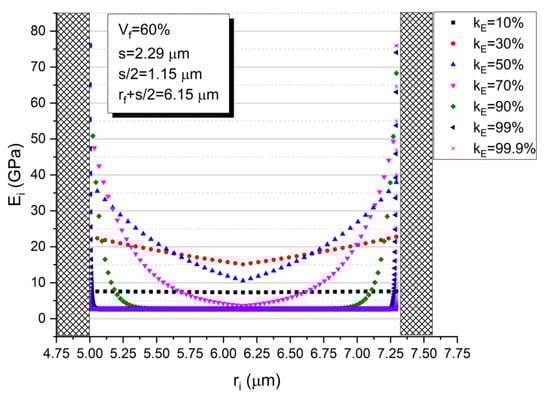 As aforementioned, assuming a hexagonal array of fibers, the separation distance S, can be calculated from Equation (4). Thus, the interphase modulus variation, within the interphasial area between two adjacent E-glass fibers, for different values of the adhesion coefficient kE, can be plotted. From this diagram, it can be seen that for kE < 0.70, the matrix material existing in the area between two successive fibers is totally modified, having a modulus higher than that of the neat matrix.