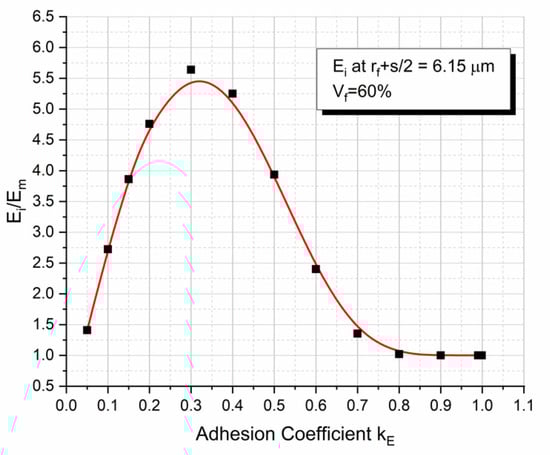 - However, when plotting the interphase relative modulus Ei/Em value corresponding to the midpoint of the fiber separation against adhesion coefficient kE, one can observe an initial and almost abrupt increase, reaching a maximum for kE = 0.3, and this is followed by a subsequent reduction of the ratio Ei/Em.