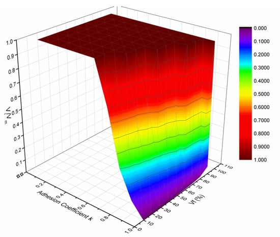 All the above-presented variations are summarized in Figure 8 where a 3D diagram is plotted showing the variation of the relative interphase volume fraction (Vi/Vm = Vi/(1 − Vf)) versus the adhesion coefficient kE and the fiber volume fraction, Vf. The resulting diagram is characteristic for glass fiber–epoxy composites with constituent properties as given in Table 1. The above 3D diagram shows that for low k-values, Vi = Vm means that all matrix material is modified into the interphase material. As the k-value increases, i.e., as the fiber–matrix adhesion increases, the interphase thickness decreases leading to a lower value of the interphase fraction Vi/Vm. In addition, all the above-mentioned variabilities are fiber volume fraction dependent.
