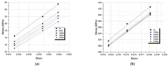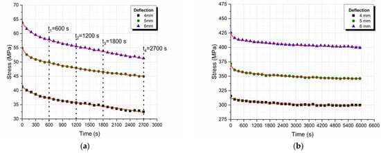 The stress–time relaxation curves for different levels of deflection are given in Figure 9a,b, for the neat epoxy resin and the GFRP composite respectively. It is observed that as the imposed flexural deflection increases, the initial stress also increases in the various stress relaxation curves, as expected. In both cases, it was observed that stress increases proportionally to the deflection applied. To verify this, isochronous curves were plotted at various times (Figure 10a,b).