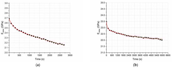 In Figure 11a,b, the relaxation moduli of both the neat epoxy resin and the GFRP composite are given, as derived by the isochronous curves. It is observed, as anticipated, that the relaxation modulus at t = 0 s corresponds to the quasistatic flexural modulus.