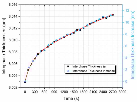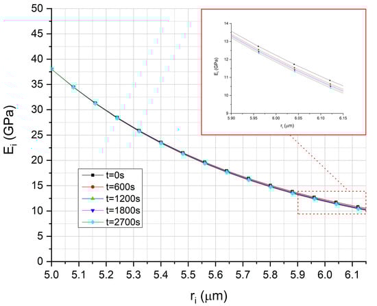 Next, by applying the HVIM, as presented in Figure 12, the interphase thickness vs. time variation was deduced. From this figure, one can observe a continuous increase in the interphase thickness with time, during relaxation. Indeed, as stresses relax in the interphase area, the degree of adhesion kE is reduced, and according to the already presented theoretical background, this results in an increase in the interphase thickness. A consequence of the above mechanism is the reduction of the interphase modulus in the radial direction at different time instants during stress relaxation, and this is shown in Figure 13.