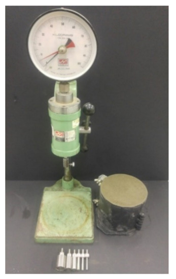 The initial and final set times of cement mortar were estimated based on ASTM C403-16 [43] (Standard Test Method for Time of Setting of Concrete Mixtures by Penetration Resistance) in order to determine the zeroing time where a restrained stress starts to develop in hardening mortar. A spring-reaction type loading device and cylindrical mold with dimensions of Φ150 × 150 mm were used to measure the changes in penetration resistance over time as shown in Figure 3. The initial and final set times were determined by interpolating the obtained data points when the penetration resistance reached 3.5 MPa and 27.6 MPa, respectively. An exponential function was used to reliably fit the data points as per the ASTM standard.