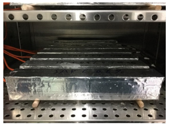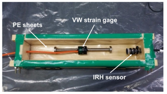 To fabricate the shrinkage specimen, fresh mortar was poured into a prismatic mold with inner dimensions of 50 mm × 50 mm × 300 mm in two layers. Each layer was vibrated for 30 sec by means of a vibrating table after manually compacting 25 times using a rigid rod. To minimize the friction between the specimen and mold during length changes, a double layer of polyethylene sheets was placed onto the inner surfaces of the mold. After 24 h, the specimen was demolded and then promptly sealed with adhesive-backed aluminum foil to prevent a moisture loss. Subsequently, all the specimens were stored in an environmental chamber maintaining 23 ± 0.5 °C while collecting the data using data loggers. Two wooden roller supports were placed underneath the specimen to allow the free deformation triggered by self-desiccation. Figure 4 and Figure 5 illustrate the test setup for autogenous shrinkage and IRH measurements and the specimens stored in the chamber, respectively.