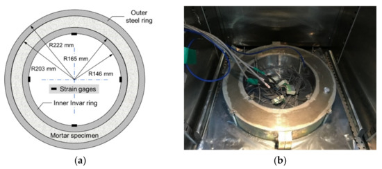 A restrained ring test device modified on the basis of ASTM C1581 [46] (standard test method for determining age at cracking and induced tensile stress characteristics of mortar and concrete under restrained shrinkage) was used to quantify the restrained stress development in hardening mortar. The inner ring of this device was made with Invar 36 (FeNi36; also known as nickel-steel alloy) with a notably low coefficient of thermal expansion (about 1/10) instead of conventional structural steel (Grade B steel) because the thermal deformation of the inner ring can be kept negligible, thereby producing a stable degree of restraint during test. The nickel content and coefficient of thermal expansion of the Invar used was 35.9 wt % and 1.57 × 10−6 mm/mm/°C at 30–100 °C, respectively. The elastic modulus of the Invar was 141 GPa. Another piece of ring with a larger diameter made of the conventional structural steel was concentrically placed outside of the inner ring. Fresh mortar was cast between the inner and outer rings in two layers; each layer was manually compacted 25 times followed by mechanical vibration for 30 s. Figure 6a,b presents the geometry of the test apparatus and actual test setup, respectively. The thickness of the mortar specimen and restraining ring was 38 and 19 mm, respectively, which resulted in a degree of restraint of the restraining ring of approximately 72% [47] comparable to that of the standard ring as per ASTM C1581. The height of both specimen and inner/outer rings was 79.2 mm. Figure 7 illustrates how the restraint provided by the inner ring induces tensile stress in the surrounding mortar specimen upon shrinkage. Four steel strain gages (FLA-5-11; Tokyo Measuring Instruments Laboratory Co., Ltd., Tokyo, Japan) with a gage length of 5 mm and a resistance of 120 Ω were circumferentially attached on the inner surface of the inner ring at a 90° interval to measure the tangential elastic strain of the inner ring caused by the shrinkage of the specimen.