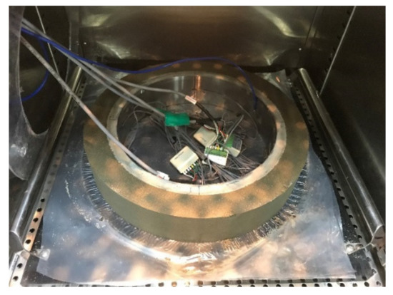The restrained ring tests were performed in two different schemes. First, fresh mortar was cast in a mold and was completely sealed for moist curing at 23 ± 0.5 °C for 24 h. Subsequently, the specimen was allowed to dry through the outer circumference at 23 ± 0.5 °C and 60 ± 1% RH until it cracked to see how the early drying affects the restrained stress development and cracking potential of the mortar incorporating SAP. Second, the specimen was initially cured in a sealed condition (autogenous condition), and then was exposed to controlled drying environment (drying condition) in order to assess the restrained stress development and cracking risk due to autogenous shrinkage and delayed external drying, considering conventional formwork-removal operations in the field. The drying commenced 100 h after final set at 23 ± 0.5 °C and 60 ± 1% RH. Similarly, with the first experimental scheme, the specimen was dried through the outer circumference only whereas the top, bottom, and inner surfaces were tightly sealed with adhesive an aluminum foil sheet, reinforced-plastic bottom plate, and outer steel ring, respectively, as can be seen in Figure 8. Once the average strain was obtained from the four strain gages, the circumferential restrained stress in the ring specimen can be calculated as follows [44]: