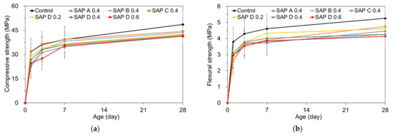 Effect of SAP addition on strengths: (a) compressive strength; (b) flexural strength.