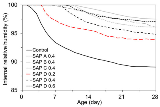 Figure 12 presents the IRH changes in each mixture measured for 28 days after final set. The IRH behavior remarkably differed depending on the type and content of SAP. First, when no SAP was added, the IRH drop started to take place soon after final set, whereas the initiation of IRH drop was considerably delayed when SAP were used. The IRH behaviors observed in the SAP D series (i.e., SAP D 0.2, SAP D 0.4, and SAP D 0.6) clearly revealed that as the SAP content increased, the initiation of IRH drop was meaningfully delayed: 4 days for SAP D 0.2, 7.9 days for SAP D 0.4, and 9.8 days for SAP D 0.6. This is because as more SAP was added with extra water, more curing water can be internally supplied via both osmotic pressure and IRH gradient between the matrix and SAP particles [54], which delayed the initiation of a self-desiccation process. This effect eventually reduced the 28-day IRH loss by 26.9% for SAP D 0.2, 47.3% for SAP D 0.4, and 55.4% for SAP D 0.6 compared to the control mixture. This trend was consistent with the results of previous studies [37,54,55]. It can also be noted from the 0.4% series (i.e., SAP A 0.4, SAP B 0.4, SAP C 0.4, and SAP D 0.4) that the rate and magnitude of IRH drop were affected by the cross-linking density and dimension of SAP. SAP C, which has the largest number of cross-links and the largest grain size, showed the most effective moisture retention performance. This is because the denser cross-links between polymer chains generate stronger elastic retraction, which in turn quickly releases the water absorbed in the SAP, raising the IRH [39]. On the other hand, SAP D 0.4 underwent relatively early and the most severe drying, probably because its high absorptivity (10.99 g/g) and medium-intensity cross-links prolong the moisture-holding time, which contributed to the slow release of the entrained water [41]. It is also interesting to note that SAP B, which has the smallest grain size, lost the IRH in a nearly constant rate. This was similar to its desorption kinetics assessed in a former study [41], and it seems to be mainly associated with the weaker van der Waals forces acting in SAP B. Additionally, the relatively faster loss of the absorbed water compared to the other types of SAP is likely related with the larger specific surface area and smaller nucleus of SAP B [56].