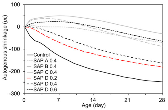 Figure 13 shows the developments of autogenous shrinkage in response to the IRH changes presented in Figure 12. Similar to the findings of previous studies [57,58], the trend of the autogenous shrinkage development was in good agreement with that of the IRH changes. This is because the IRH changes build up a pressure in capillary pores, and in turn drive the matrix to undergo shrinkage/swelling [59]. Overall, the mixtures with SAP experienced about 26.7% to 87.4% less autogenous shrinkage due to the IC effect provided by SAP with extra water. Some mixtures (i.e., SAP C 0.4, SAP B 0.4, and SAP D 0.6) even showed early swelling of approximately up to 50 µɛ, offsetting the subsequent autogenous shrinkage. SAP B 0.4 underwent the highest rate of autogenous shrinkage development because SAP B formed a finer pore structure in the matrix, thereby resulting in a stronger negative capillary pressure upon drying [60]. From the above findings, it was apparent that, under a “sealed” condition, the addition of SAP effectively counteracted the initiation of self-desiccation and corresponding autogenous shrinkage, and thus can be a promising measure to ensure effective IC of cement-based materials, particularly with a low w/b.