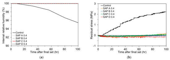 Figure 14a shows the IRH changes in the mixtures reconstructed on the basis of Figure 12, highlighting the influences of SAP addition and type. Moreover, Figure 14b displays how the SAP addition and type affect the residual stress development in the ring under a sealed and isothermal condition for 100 h after final set. The residual stress was calculated based on Equation (1). It is noteworthy that the tendency of IRH changes observed in Figure 14a was quite similar to that of restrained stress development in Figure 14b. Whereas the control mixture with no SAP and extra curing water exhibited a sharp build-up of tensile stress as it experienced a rapid IRH drop soon after final set, no or very little increase in restrained stress was observed for the other mixtures with 0.4% SAP (i.e., SAP A 0.4, SAP B 0.4, SAP C 0.4, and SAP D 0.4). It is highly probable that the extra water supplied by SAP maintained the IRH of the mixtures very high (i.e., almost 100% RH) throughout the test period, and thus the autogenous shrinkage in those mixtures was mostly eliminated. These findings, in combination with the data shown in Figure 12 and Figure 13, clearly indicate that the early-age stress build-up and resulting cracking risk caused by autogenous shrinkage can be effectively mitigated by adding SAP and extra curing water.