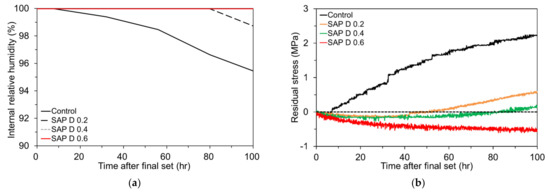 The effect of SAP content on the IRH changes and corresponding early-age shrinkage stress development in the mortar ring is depicted in Figure 15a,b. Figure 15a was redrawn from Figure 12 for clarification. It is seen that the IRH of SAP D 0.2 commenced to diminish about 80 h after final set while that of SAP D 0.4 and SAP D 0.6 was maintained nearly 100% over the entire test period. It can be attributed to the fact that, as aforementioned, the lesser the SAP content, the lesser the IC water is stored in SAP and thus emptied earlier. Figure 15b shows the restrained stress development in the mortar ring when the IRH changes presented in Figure 15a were imposed. First, note that the residual tensile stress build-up was significantly lowered by adding SAP. Whereas the control mixture showed a residual tensile stress of 2.23 MPa after 100 h of final set, the other mixtures with SAP hardly allowed the accumulation of tensile stress. Particularly, no tensile stress was even developed for SAP D 0.6, which is benefited from the early expansion as confirmed in Figure 13. Furthermore, it can be seen the residual tensile stress was reduced almost in proportion to the SAP content. The residual stress after 100 h of final set was found to be 0.54 MPa for SAP D 0.2 (76% lower than control), 0.14 MPa for SAP D 0.4 (94% lower than control), and -0.56 MPa (compression) for SAP D 0.6. The discrepancies seem to be caused by the amount of extra curing water stored in SAP. Based on this finding, it is recommended to use more than 0.4% SAP (by mass of cement) in order to adequately limit the autogenous shrinkage development at early ages although dosage adjustment may be needed depending on the absorptivity of SAP and mixture proportions. Lastly, it is also of great importance to see that the IRH changes in Figure 15a were well matched with the restrained stress development in Figure 15b. While no or negligible residual tensile stress was developed for SAP D 0.4 and SAP D 0.6, of which the RH was maintained nearly 100% for the entire test period, SAP D 0.2 began to show a tensile stress build-up after about 60 h, as some IRH loss occurred as noted in Figure 15a. As discussed earlier, the control mixture initiated a gradual IRH drop shortly after final set, which in turn caused a steady increase in tensile stress over the test period.