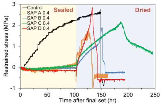 - However, the addition of SAP, irrespective of its content, hardly contributed to the gaining of sufficient resistance to cracking when directly exposed to drying environment because a rapid increase in residual stress and eventual cracking were observed as soon as the specimen was unsealed for external drying.