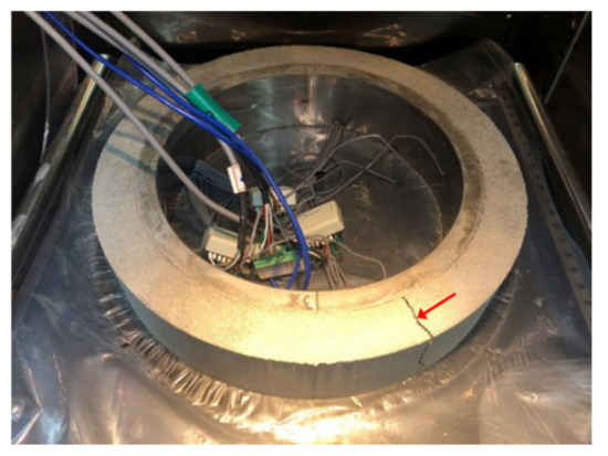 - ASTM C1581/C1581M-18a. Standard Test Method for Determining Age at Cracking and Induced Tensile Stress Characteristics of Mortar and Concrete under Restrained Shrinkage; ASTM International: West Conshohocken, PA, USA, 2018. [Google Scholar]