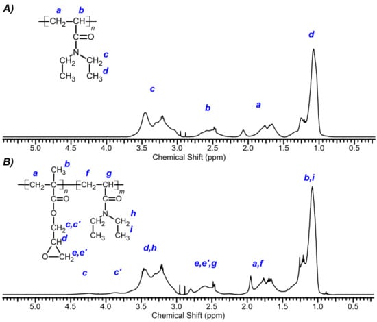 1H NMR spectra of the PDEAAm homopolymer (A) and the P(DEAAm-co-GMA) copolymer (Sample A, molar feed ratio AIBN:DEAAm:GMA = 1:95:5) (B).