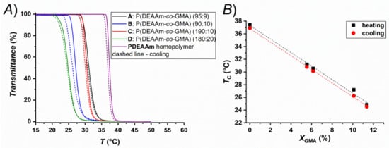 The thermoresponsive behavior of the P(DEAAm-co-GMA) copolymers was investigated by turbidity measurements under the conditions proposed for standardization of the determination of critical solution temperatures of thermoresponsive LCST-type and UCST-type polymers [46,47]. As shown in Figure 3A, the transmittance–temperature curves of the heating and cooling cycles indicate reversible thermoresponsive precipitation–dissolution transitions for both the PDEAAm homopolymer and all the investigated copolymers with relatively small extent of heating–cooling hysteresis due to the lack of hydrogen bond formation between the PDEAAm chains in accordance with previous results [96]. The critical solution temperature (TC) is defined as the temperature at the inflection point of the transmittance–temperature curves, i.e., the so-called cloud point temperature (TCP) for heating and the clearing point temperature (TCL) for cooling. As presented in Figure 3B and Table 2, the critical solution temperatures decrease linearly with decreasing DEAAm, i.e., with increasing GMA content, independent of the molar mass of the copolymers. It should also be noted that incorporating relatively low amounts of GMA in the P(DEAAm-co-GMA) copolymers results in significant decrease of the critical solution temperature (TC) values (from 37.4 °C for the homopolymer to 24.8 °C at 11.4 mol% GMA in the copolymer), and this can be well tuned on the basis of the found linear relationship between TC and the composition of the P(DEAAm-co-GMA) copolymers. Similar tendency was found for the critical solution temperature versus composition of poly(N,N-dimethylacrylamide-co-glycidyl methacrylate) copolymers but at much higher GMA contents (32–50 mol%) [124].