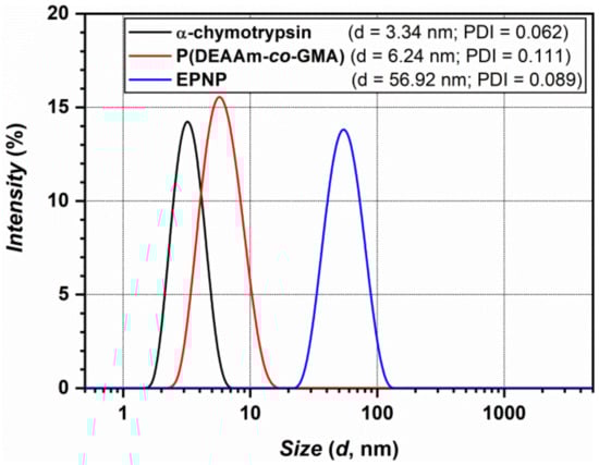 One of the intensively investigated application of epoxy(glycidyl)-functionalized polymers is their conjugation with various biomaterials, such as proteins and enzymes. In our work, the applicability of the produced epoxy-functional thermoresponsive P(DEAAm-co-GMA) copolymers for bioconjugation was investigated via a direct reaction between α-chymotrypsin, a widely used enzyme, and one selected copolymer (Sample C), as depicted in Scheme 1. Under the conditions described in the Experimental, 22.5 mg dried conjugate was obtained, which means that the yield of the conjugation was 48%. The resulting conjugate was investigated by DLS measurement and the results are compared to that of the starting copolymer sample and the enzyme. The recorded size distribution curves are presented in Figure 4. The size of the α-chymotrypsin is 3.34 nm with low dispersity, which corresponds well to the literature value [125]. The size of the P(DEAAm-co-GMA) copolymer is somewhat larger and has broader size distribution (d = 6.24 nm, PDI = 0.11). As observed, the size of the resulting enzyme–copolymer conjugate is in the range of 30–100 nm with average size of 56.9 nm. In addition, peaks do not appear in the range of the size of the reactants, which means that all unreacted copolymer and enzyme was removed by the applied dialysis purification method. These findings provide clear evidence that the designed one-step reaction took place successfully, and enzyme–polymer nanoparticles (EPNPs) are formed in the direct conjugation reaction between the P(DEAAm-co-GMA) copolymer and α-chymotrypsin. It has to be noted that usually epoxy containing carriers, i.e., polymers or inorganic particles, are first converted to amine by either treating with ammonia or a diamine, and then the conjugation (coupling) to the enzyme is carried out by glutaraldehyde [114,115]. In contrast to this widely applied two-step conjugation process, the P(DEAAm-co-GMA) copolymers enable an efficient one-step conjugation reaction with amine containing proteins and enzymes as proved by our results. This finding may open new routes for a variety of novel protein-polymer conjugations, especially by applying the biocompatible thermoresponsive epoxy-functionalized PDEAAm.