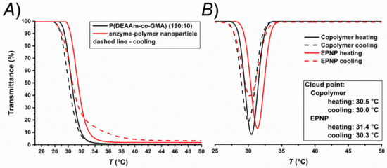 The transmittance versus temperature curves for obtaining the critical solution temperatures (TC), i.e., the cloud point (TCP) and the clearing point (TCL) were measured by a UV–Vis spectrophotometer (Jasco V-650, JASCO Corporation, Tokyo, Japan) equipped with Jasco MCB-100 (JASCO Corporation, Tokyo, Japan) mini circulation bath and Peltier thermostat. Standard 1 cm × 1 cm cuvettes were used for these measurements. Deionised water was used as reference and solvent. The polymer and the enzyme–polymer nanoparticle solutions (1 mg/mL) were heated and then cooled in the temperature range of 15 to 50 °C with 0.2 °C/min heating/cooling rate and the transmittance was recorded at 488 nm according to recent studies on the standardization of measurements for the determination of the critical solution temperatures [46,47]. The inflection points of the transmittance–temperature curves were taken as both the TCP and TCL values.