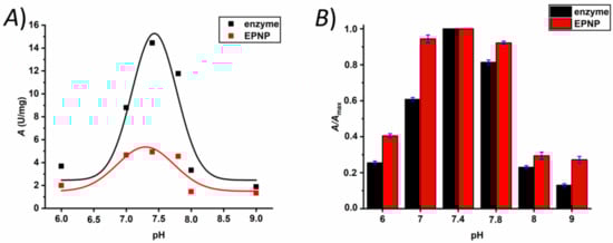 The applicability of the produced EPNP and the effect of the conjugation on the catalytic activity were investigated by enzymatic activity assay, where the enzymatic hydrolysis of BTEE was followed by UV-Vis spectroscopy at 25 °C in solutions of various pH and after thermal treatment at 45 °C. The enzymatic activity was calculated based on the rate of the conversion of the BTEE substrate. The determined enzymatic activity of the α-chymotrypsin-P(DEAAm-co-GMA) EPNP in the 6–9 pH range is presented and compared to the unmodified enzyme in Figure 6. As can be seen in this Figure, the enzymatic activity of the EPNP is significantly lower than that of the native enzyme, but this is a general phenomenon in the case of enzyme conjugates [50,51,52]. This can be explained by decreased accessibility of the substrate to the active pocket of the enzyme in the enzyme–polymer conjugates. The highest enzymatic activity was observed in the pH 7–7.5 range. The pH optimum was determined by the inflection point of the first derivative of the Gauss function fitted on the activity data. As shown in Figure 6A, on the one hand, the pH optimum of the EPNP is slightly lower (pH = 7.3) than that of the native enzyme (pH = 7.4). On the other hand, the activity is greatly decreased even with a slight change in pH in the case of the native α-chymotrypsin, but only a lower extent of change of activity was observed for the EPNP.