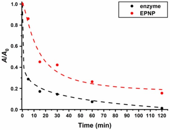The thermal stability of the enzyme–polymer nanoconjugate was also studied. The solution of the EPNP and the native enzyme as well was thermostated at 45 °C, and samples were taken at predetermined treatment times. Because the results of the thermoresponsive investigation of the EPNP shows that the hydrophobic–hydrophilic transition occurs in a wider temperature range during cooling, the withdrawn samples were allowed to cool to room temperature for 5 min before the activity assay measurements at 25 °C. The obtained relative activity plotted as a function of the thermal treatment time is displayed in Figure 7. As can be seen in this Figure, the initial activity of the free α-chymotrypsin decreases to 20% after only 10 min and to 10% after 60 min, and the enzyme becomes completely inactive after 120 min thermal treatment. This finding is in good agreement with results of others [118], according to which native CT loses its activity after thermal treatment at 50 °C for 90 min. It is widely accepted that this caused by the unfolding and inactivation during thermal denaturation of the enzymes. In contrast, the residual activity of the polymer conjugated enzyme in the EPNP is much higher, namely the relative activity is around 85% after five minutes and it is still over 40% after 30 min. Furthermore, the enzymatic activity of EPNP does not fall below 20% even after two hours thermal treatment. These results clearly indicate that the conjugated polymer can reduce the thermal unfolding of the enzyme in the produced nanoconjugate. Hence, it can be concluded that the enzyme–polymer nanoparticle preserves the enzymatic activity after heating, that is, the conjugation with the thermoresponsive P(DEAAm-co-GMA) copolymer increases advantageously the thermal stability of α-chymotrypsin.