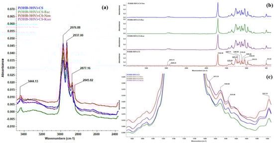 General IR spectra of P(3HB-3HV)-CS, P(3HB-3HV)-CS-Bac, P(3HB-3HV)-CS-Neo and P(3HB-3HV)-CS-Kan spheres (b), and zoomed in regions to evidence C-H (a) and amide (c) vibrations.