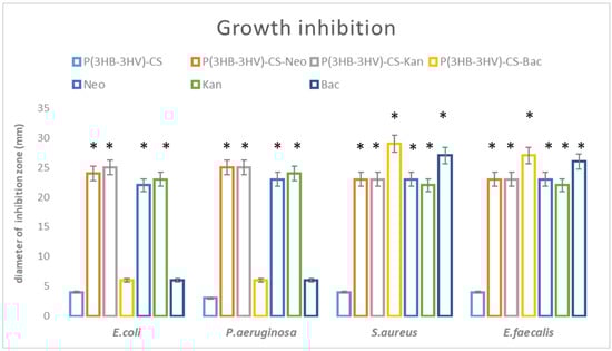 Graphic representation of antimicrobial potential of the obtained spheres, represented as diameter of inhibition zone evaluated for E. coli, E. faecalis, P. aeruginosa and S. aureus after 20 h incubation. * p < 0.05 (control sample = P(3HB-3HV)-CS was compared to antibiotic containing samples).