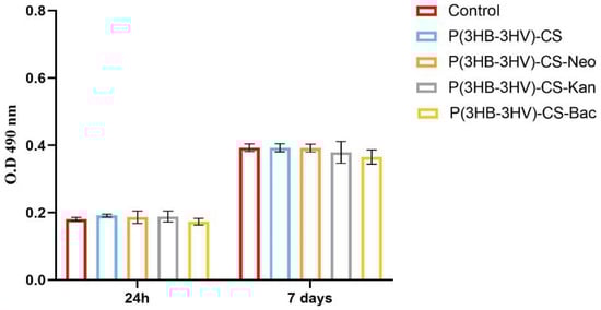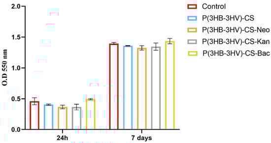 Graphic representation of human dermal fibroblasts viability after 24 h and 7 days of exposure to simple and Bac-/Neo-/Kan-loaded P(3HB-3HV)-CS spheres as revealed by the MTT assay. The represented data are the mean values of three independent experiments ± S.D.