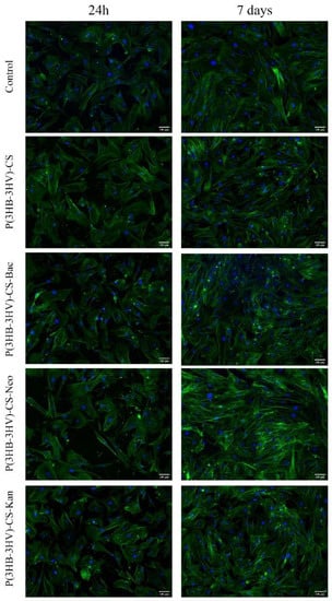Fluorescence micrographs revealing the cellular morphology of the human dermal fibroblast treated for 24 h and 7 days with simple and Bac-/Neo-/Kan-loaded P(3HB-3HV)-CS spheres. F-actin filaments are stained with phalloidin-FITC (green) and nuclei are stained with DAPI (blue). Scale bar = 100 µm.
