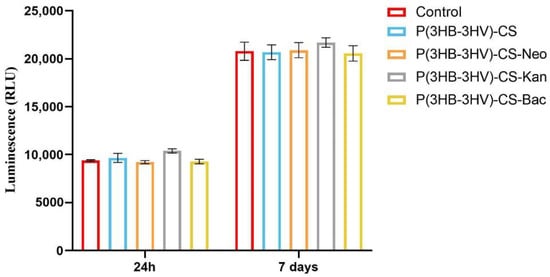 Despite the emerging need for developing efficient anti-infective therapeutic strategies, the biocompatibility of newly designed antibiotic delivery platforms is a mandatory step that needs to be addressed for their prospective use. As human dermal fibroblasts represent key players [,] in the wound healing process, the CCD—1070Sk cells were selected as an in vitro cellular model for assessing the cytotoxic potential of herein proposed antibiotic- loaded spheres. Therefore, CCD—1070Sk cells were exposed for 24 h and 7 days to simple and Bac/Neo/Kan- loaded P(3HB-3HV)-CS spheres.