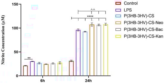Graphic representation of the nitrite levels as a measure of NO release in LPS-activated RAW 264.7 macrophages cell cultures exposed for 6 h and 24 h to simple and Bac-/Neo-/Kan-loaded P(3HB-3HV)-CS spheres treatment. The represented data are the mean values of three independent experiments ± S.D. (** p ≤ 0.01 LPS vs. control; ^^ p ≤ 0.01 sample vs. LPS; **** p ≤ 0.0001 sample vs. untreated control).