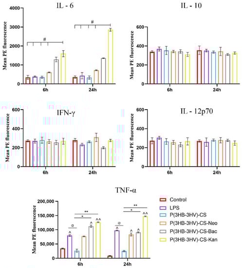 Graphic representation of IL-6, IL-10, IFN-γ, IL-12p70 and TNF-α cytokine levels released by LPS-activated RAW 264.7 macrophages after 6 h and 24 h of exposure to simple and Bac-/Neo-/Kan- loaded P(3HB-3HV)-CS spheres treatment. The experimental control was represented by media samples collected from non-stimulated RAW 264.7 cell cultures (# p ≤ 0.05 P(3HB-3HV)-CS-Kan vs. control and samples; ^ p ≤ 0.05 and ^^ p ≤ 0.01 sample vs. control; @ p ≤ 0.05 samples vs. LPS; * p ≤ 0.05 and ** p ≤ 0.01 samples vs. P(3HB-3HV)-CS). The represented data are the mean values of three independent experiments ± S.D.