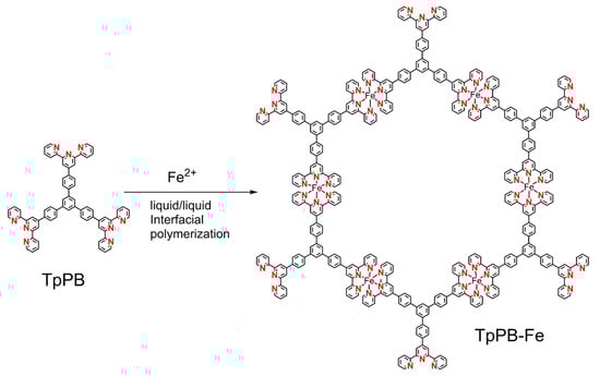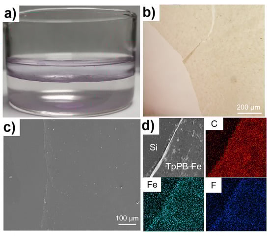Starting from commercial 4-formylphenylboronic acid, the 4′-(2,2′:6′,2″-terpyridine) phenylboracic acid was prepared by condensation reaction with 2-acetylpyridine, according to previous work []. After the Suzuki reaction with 1,3,5-triborombenzene, the target monomer of 1,3,5-tri(4-(2,2′:6′,2″-terpyridine)phenyl) benzene (TpPB) was obtained successfully. The detailed information could be found in Supporting Information (Scheme S1, Figure S1–S4). The fabrication of coordination polymer film (TpPB-Fe) with the topological structure (without counter anions) is shown in Figure 1. Owing to the high coordination terpyridine with transition-metal atoms, the liquid–liquid interfacial polymerization toward TpPB-Fe films in the circumstance of a dichloromethane (CH2Cl2) solution of TpPB as the lower layer and an Iron(II) tetrafluoroborate hexahydrate (Fe(BF4)2•6H2O) aqueous solution as the upper layer. A resultant purple, free-standing film was almost covering the whole liquid interface (Figure 2a), which could be transferred onto various substrates, like Si wafer. The topographic characteristics of the TpPB-Fe film were investigated by scanning electron microscopy (SEM), optical microscopy (OM) and atomic force microscopy (AFM). In Figure 2b, OM image shows the obtained coordination polymer film with a macroscopic lateral dimension (>1 cm2). The partial wrinkles and crack indicate the flexible nature of TpPB-Fe film, which were folded when it transferred onto the silica wafer. The SEM image demonstrates that this film has the uniform surface with the differential edged regions (Figure 2c). The energy-dispersive X-ray spectroscopy mapping (EDX-mapping) results confirm that Fe, N and C are homogenously distributed in TpPB-Fe (Figure 2d). AFM result reveals that the average thickness of TpPB-Fe film is ~300 nm (Figure S5). These results demonstrate that bottom-up coordination reaction of terpyridine groups with Fe(II) ions gives them the ultrathin and free-standing coordination polymer film.