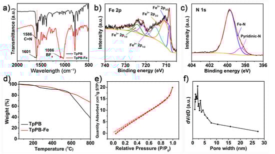 (a) The FTIR spectrum of TpPB-Fe coordination polymer between (b) Fe 2p and (c) N 1s XPS spectra of TpPB-Fe; (d) TGA curve of TpPB and TpPB-Fe; (e) Nitrogen adsorption/desorption isotherm of TpPB-Fe; (f) pore size distribution for TpPB-Fe.