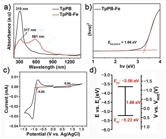 (a) The UV–Vis spectra of TpPB and TpPB-Fe; (b) bandgap (Ebg, optical) of TpPB-Fe determined from the Kubelka–Munk-transformed reflectance spectra for TpPB-Fe; (c) cyclic voltammogram (CV) curve of TpPB-Fe; (d) band structure diagram for TpPB-Fe.