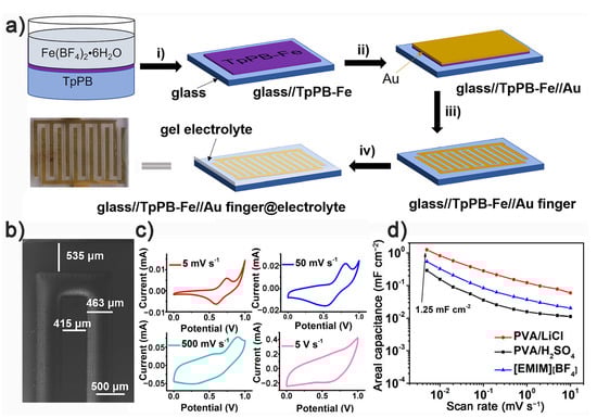 (a) Schematic illustration of TpPB-Fe films for on-chip MSCs on a silica substrate, (i) transferring TpPB-Fe films onto the glass substrate, (ii) sputtering an Au layer on TpPB-Fe film, (iii) laser scraping TpPB-Fe//Au heterolayer into interdigital pattern, iv) drop-casting of gel electrolyte on interdigitated electrode; (b) The size information of cross finger electrode; (c) CV curves of TpPB-Fe-MSC with PVA/LiCl gel electrolyte at scan rates of 5, 50, 500, 5000 mV s−1; (d) areal capacitance at scan rates from 5 to 10000 mV s−1 with the electrolytes of PVA/LiCl (red), [EMIM][BF4] electrolyte (blue) and PVA/H2SO4 (black), respectively.