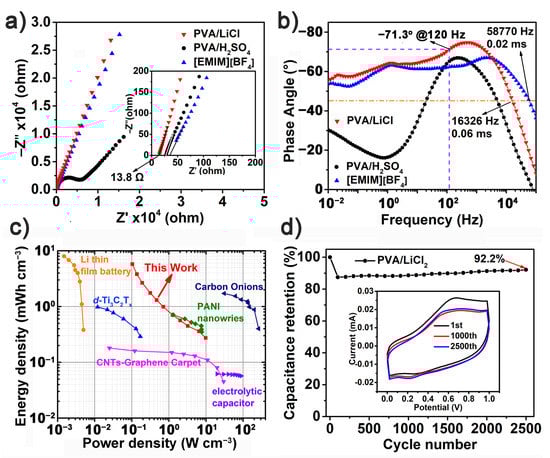 (a) Nyquist plots; (b) impedance phase angles on the frequency of TpPB-Fe-MSCs with PVA/LiCl (red), PVA/H2SO4 (black) and [EMIM][BF4] (blue); (c) Ragone plots for TpPB-Fe-MSCs with PVA/LiCl (red), PVA/H2SO4 (black) and [EMIM][BF4] (blue), comparing with other reported MSCs; (d) Cycling stability of TpPB-Fe-MSC with PVA/LiCl electrolyte (scan rate: 500 mV s−1), insert: the 1st, 1000th, 2500th CV curves of TpPB-Fe-MSC with PVA/LiCl electrolyte.