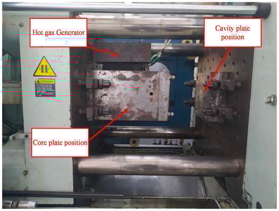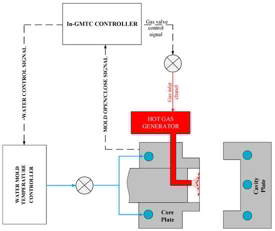 In line with our previous research into the GMTC [,], the hot gas generator consisted of an air compressor, an air dryer, a gas valve for volumetric flow control and a high-efficiency gas heater. In this research, the function of the high-power hot gas generator system was to support a heat source, providing a flow of hot air up to 400 °C with an inlet gas pressure of up to 7 bars. In this research, the hot gas generator was hung on the mold so that, in each cycle, the heating process could be started without the support of other equipment such as in the external gas-assisted mold temperature control (Ex-GMTC). Another advantage of this method is that the distance between the hot gas generator and the heating surface was reduced, meaning that the wasted energy was reduced. For the coolant system, a mold temperature controller was used to provide the water at a defined temperature to cool the mold after the filling process and to warm the mold to the initial temperature at the beginning of the experiment. In this research, the initial mold temperature was set at 40 °C. To both control and observe the temperature at the cavity surface, five temperature sensors were used to obtain the real-time mold temperature and to provide feedback to the In-GMTC controller.