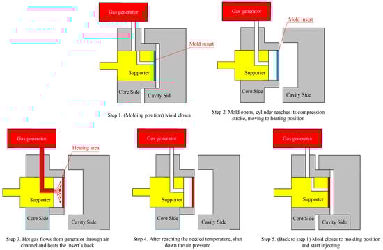 In this research, hot gas was used as a heating source to increase the cavity surface temperature of the injection mold. For the heating operation, first, by opening the mold, two mold plates moved from the closing position to the opening position (Figure 2—Step 1 and Step 2). In Step 2, the supporter moved backward to create a gap between the supporter block and the mold insert. This gap allowed the hot gas to flow and make contact with the mold insert. Second, the hot gas drier was moved to the heating position, as shown in Figure 2—Step 3. Then, the air was heated as it flowed through the gas drier and the outside of the gas drier transferred the hot air, which contacted directly with the cavity surface. This hot gas heated the cavity surface to the target temperature (Figure 2—Step 3). Third, when the mold reached the required temperature, the air supply was turned off (Figure 2—Step 4). Then, the mold was completely closed in preparation for the filling process of the melt (Figure 2—step 5). In Step 5, the supporter block moved toward and contacted with the mold insert so that the mold insert did not become deformed when it stopped due to the filling pressure from the hot melt.