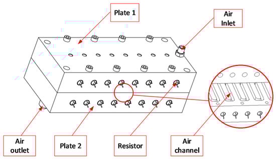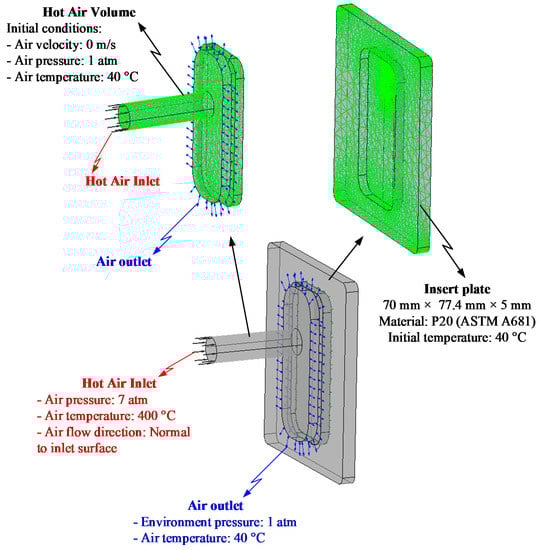 Figure 3 shows the position of the In-GMTC and the mold plate in the injection molding. The gas drier, with a size of 240 mm × 100 mm × 80 mm, is shown in Figure 4. The gas channel was cut inside the gas drier with a width of 5 mm and depth of 10 mm. In this research, the mold cavity was filled by an insert with a size of 77 mm × 77.4 mm. The inserts and the locations of temperature measurement are shown in Figure 5. To observe the heating effect of In-GMTC on the stamp temperature, five temperature measurement points were used. One was located at the top point, which was close to the outlet of the gas drier. The other four were located as shown in Figure 5. In this paper, the influence of stamp thickness on the heating process was observed. To study the temperature distribution of the heating area, a simulation model was built as in the experiment. Because the stamp was inserted into the mold, there was a small air gap between the stamp and the mold; thus, within a short time, this air gap acted as an insulation layer. Therefore, according to previous research [,], the simulation model included only two volumes: the stamp volume and the air volume. The geometric view and the meshing model of the system are shown in Figure 6 and Table 1. In this model, the hot gas temperature was varied from 200 to 400 °C under a pressure of 7 bar. The direction of this hot gas flow was set perpendicular to the heating surface. In the simulation, the initial gas volume was set at 40 °C with a pressure of 1 atm. The outlet of the hot gas was set as the opening area, with an air temperature of 40 °C and a pressure of 1 atm. In addition, the initial temperature of the P20 steel insert was set at 40 °C. In order to improve the simulation precision, a hex-dominant element was used to mesh the insert part. To improve the simulation accuracy, a small element size was applied at location S1. In addition, the inflation meshing method was applied with 10 layers at the contact surfaces. In the simulation, the heat transfer mode around all external surfaces of the mold plate was set to free convection to the air, with an ambient temperature of 40 °C and a heat transfer coefficient of 10 W/m2 K. The heating process was simulated using ANSYS software (ANSYS, Inc., Ho Chi Minh City, Vietnam) with the same experimental parameters.