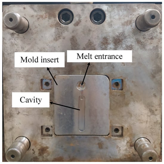 To observe the influence of In-GMTC on the melt flow length, the real molding process was performed with the cavity insert as in Figure 5. This insert was added into the cavity plate as shown in Figure 7. This cavity had a size of 46 mm × 8 mm. The insert was manufactured for the experiment with melt flow thicknesses of 0.1, 0.2, 0.3, 0.4, and 0.5 mm. With the common injection molding process, this range of thicknesses represents a kind of thin wall injection molding, which easily results in the short shot problem when the injection pressure is low; however, with an overly high injection pressure, the flash problem easily arises. Thus, with the ability of mold temperature control, the In-GMTC was applied for this molding process to observe the improvement in product quality when the injection molding process was operated with a moderate injection pressure. In this paper, polyamide 6 reinforced with 30 wt.% of glass fiber (PA6/GF30% from Lanxess AG, Cologne, Germany) was used for the molding process, and the molding parameter was maintained for all testing cases, as shown in Table 2. The SW-120B (Shine Well Machinery Co., Ltd., Taichung City, Taiwan) molding machine was used in the experiment.
