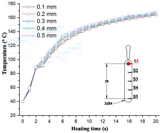 To observe the influence of part thickness on the heating step, five stamp thicknesses were used for the experiment. Figure 8 shows that with thicknesses of 0.1, 0.2, 0.3, 0.4, and 0.5 mm, the temperature at sensor S1 varied from 164.3 to 170.4 °C; this means that the heating rate increased from 6.2 to 6.5 °C/s. The increase in heating rate when the part thickness increased can be explained by the thermal energy needed to heat the stamp volume. Because the stamp and the mold plate were separated by an isolation layer, with the same heating source, the heating result mainly depended on the stamp volume. So, with a thinner stamp, more thermal energy is needed to increase the stamp temperature. Based on the design shown in Figure 5c, because the stamp thickness and gap between the gas gate to the heating surface were 5 and 3.5 mm, respectively, with a thicker part, the less material there was at the cavity; therefore, a better heating rate was achieved with a thicker product. However, the difference in the heating rate when the part thickness changed from 0.1 to 0.5 mm was small. Therefore, in thin wall injection molding, this property is an advantage of this heating method, which could support mold temperature control with a thin wall part and a thickness that could be varied to lower than 0.5 mm.