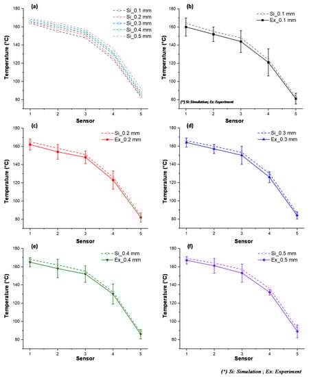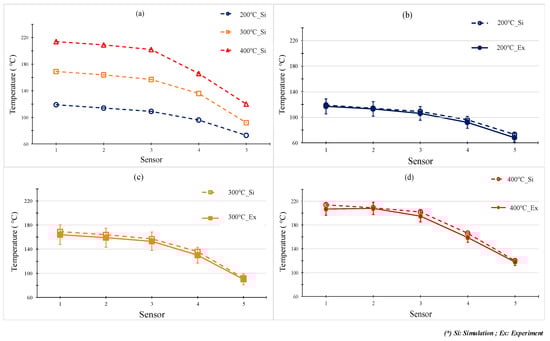 To verify the accuracy of the simulation result, the experiment achieved the same boundary condition as that in the simulation. The experiment was performed 10 times for each case; after that, the average value was represented for each case. Then, the temperature at the sensors was measured and compared with the simulation result, as shown in Figure 10. The comparison shows that the temperature difference between the simulation and experiment was lower than 10 °C. This difference is due to the measurement delay of the sensor, especially as, in this state, the thermal energy transferred quickly from the higher temperature area to the lower temperature area. However, in general, this result shows that the results of the simulation and the experiment have a good agreement.